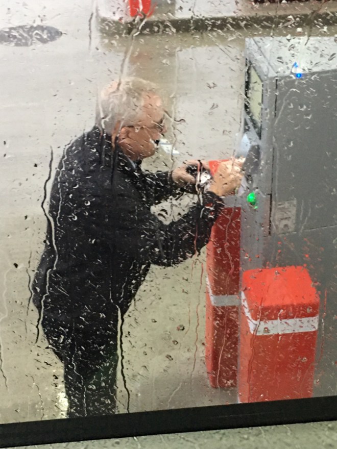Keith getting gasoline in the rain!