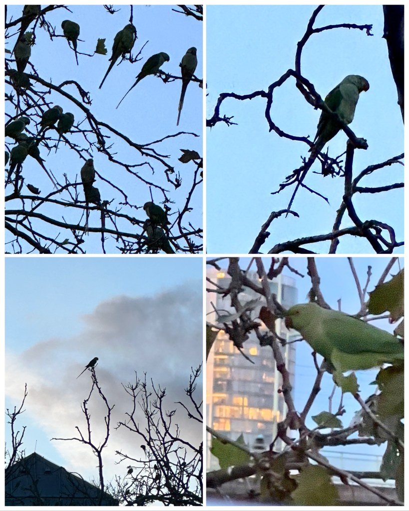 In the morning before dawn, I heard lots of birds outside the window. When I asked, they said they were hundreds of green parrots in the sycamore trees outside our ship. They come at sunset and leave at sunrise. I photographed them as they returned around 6 o’clock.