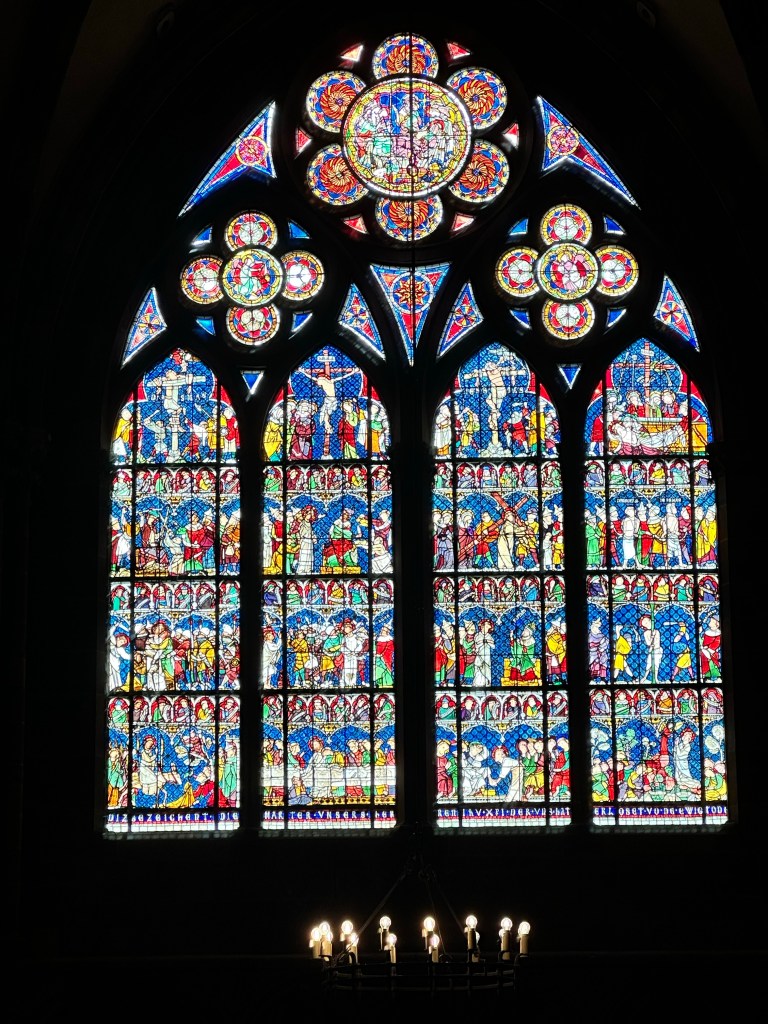 In World War II, the people of the town removed the Stainglass windows to prevent the destruction by the Nazis. They were hidden in a salt mine and rescued by the monument men in 1945 and returned to the Cathedral.
