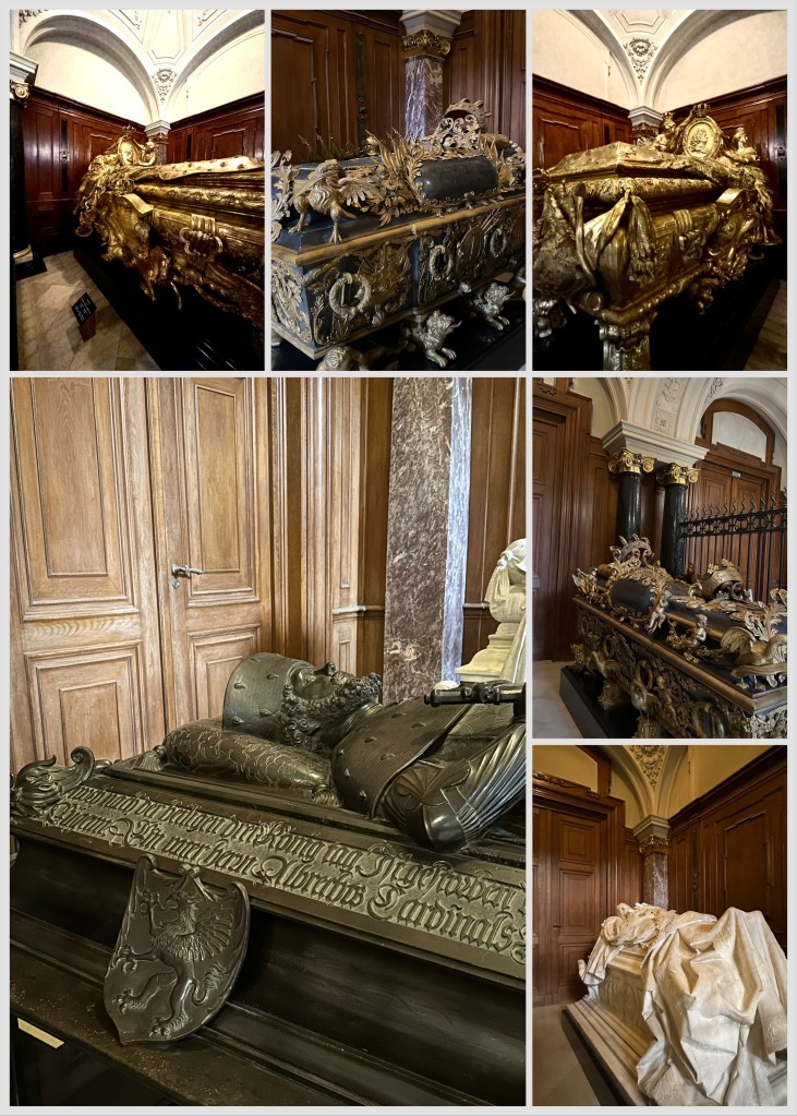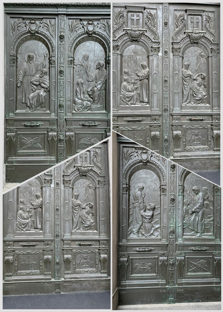 Exterior Doors of the Cathedral with visual stories from the Bible. Mosaics at the entrance to the Dom. How many do you see?Interior Sanctuary. Dom interiors with the dome, organ, lectern, two photos of the altar.In each corner of the dome are small dome areas with the gospel writers, Matthew, Mark, Luke and John.Organ is to the left of the congregation.Stairs (270) to the top of the dome. Steps to the crypt were closed. I did not go up to the top, only the first landing.There is a crypt in the basement of the Dom which is closed presently. Ornate sarcophagi of royal family and church leaders are on the main floor. Thanks for reading. Ellen
