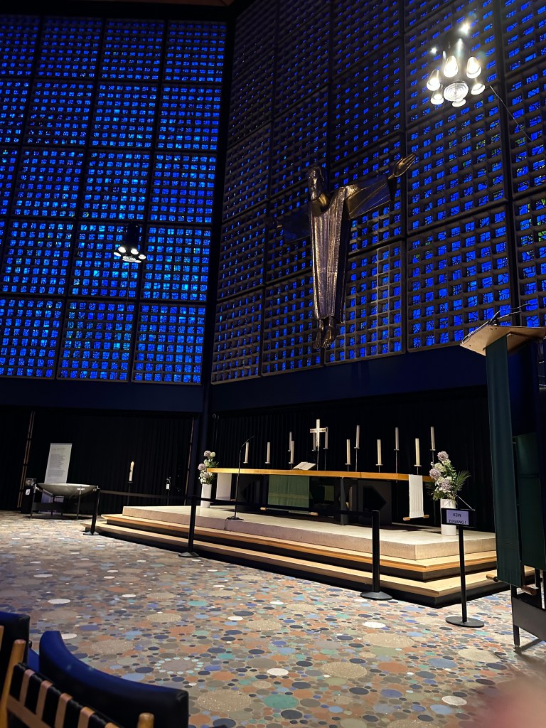 Kaiser Wilhelm Memorial Church (1890-1943) new sanctuary built in 1962 is on the right, Protestant: Evangelical Church of Berlin, Built in 1890 by Kaiser Wilhelm II in honor of his grandfather, Kaiser Wilhelm I. View in 1933, then the bombed church in 1945 photo and the vestibule left to remember what WAR can do. New (1963) sanctuary that will hold 1000 made with stained glass in concrete walls.Interior. Christ as He goes to HeavenInterior with music from the beautiful organ.