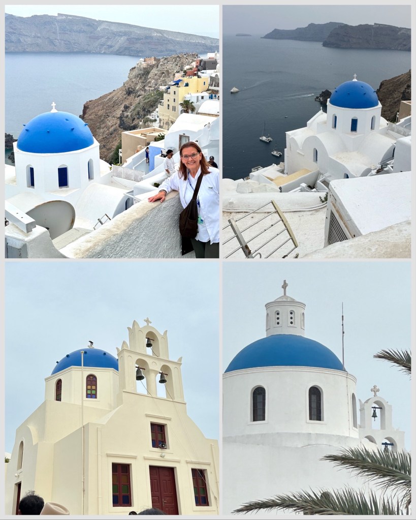 Our excursion of Santorini required planning. First the standard boat ride from the ship, then a 6 Euro cable car up to the top of the island (better than the 600 steps), and finally a 20 Euro taxi across the island which gave us access to visit their beautiful churches just like the excursions. (Also we each saved 50 Euros)